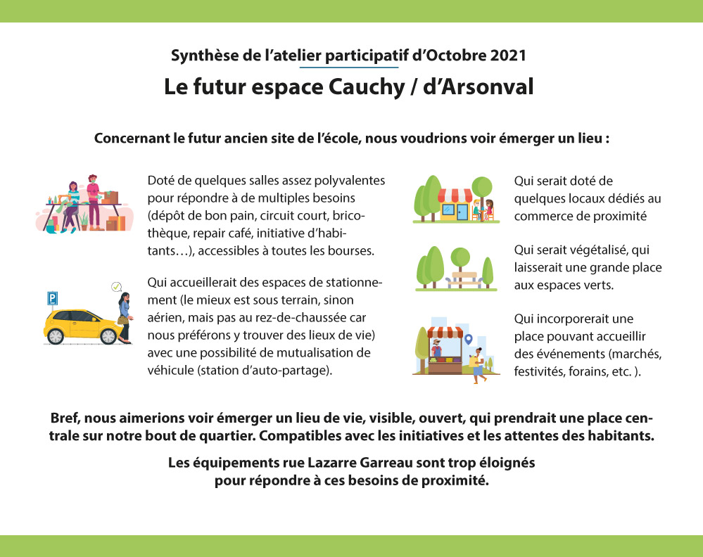Dans le cadre de la future école, nous avions aussi esquissé les souhaits des habitants concernant l’aménagement d’un futur espace Cauchy d’Arsonval :