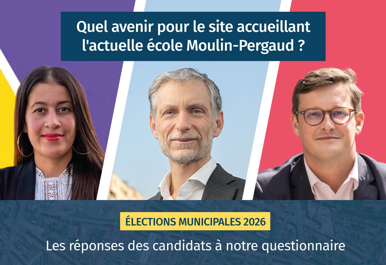 Nous interpelions dans notre courrier les candidats sur les projets qu’ils comptaient impulser sur le site accueillant l’actuelle école Moulin Pergaud. Même si tous les candidats conviennent qu’il ne s’agit que de propositions, qui doivent être au préalable discutées avec de nombreuses parties prenantes, les propositions de chaque candidat reflètent une vision de notre quartier propre à chaque liste.
